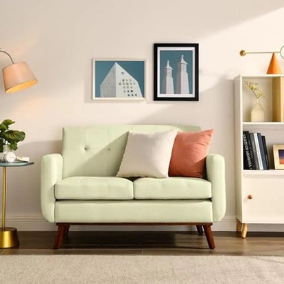 Durable & Stylish: This couches for small spaces is designed with classic turned legs and exquisite craftsmanship to make it more gorgeous and elegant, Meanwhile the brown legs provide strong stability and durability to the sofa. Maximum load capacity 400 Ibs.