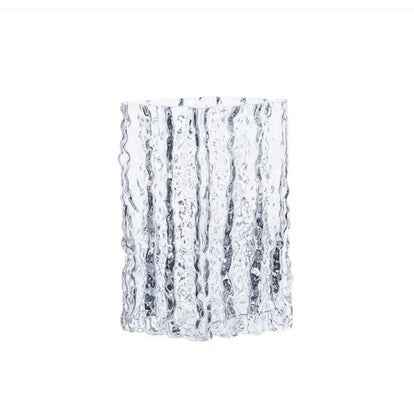 Beautiful transparent textured glacier vase that gives the effect of water waves or decorative ice. Can be used as vase for flowers or stand alone decorative art peice.