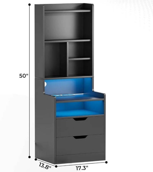 Charging Nightstand Set of 2 with LED Lights Tall Night Stand with Bookshelf Bedside Table with Drawers Side Tables Bedroom