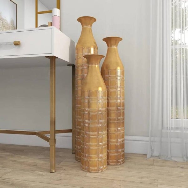 Gold Flower Vase Decoration Home Metal Tall Distressed Metallic Vase With Etched Grid Patterns Vases Set of 3